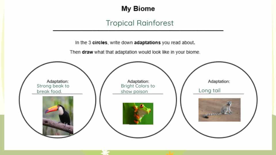 Each pair received a short passage describing one biome: its climate, location, unique plants, and the animals that live there. After reading and discussing, students were challenged to: